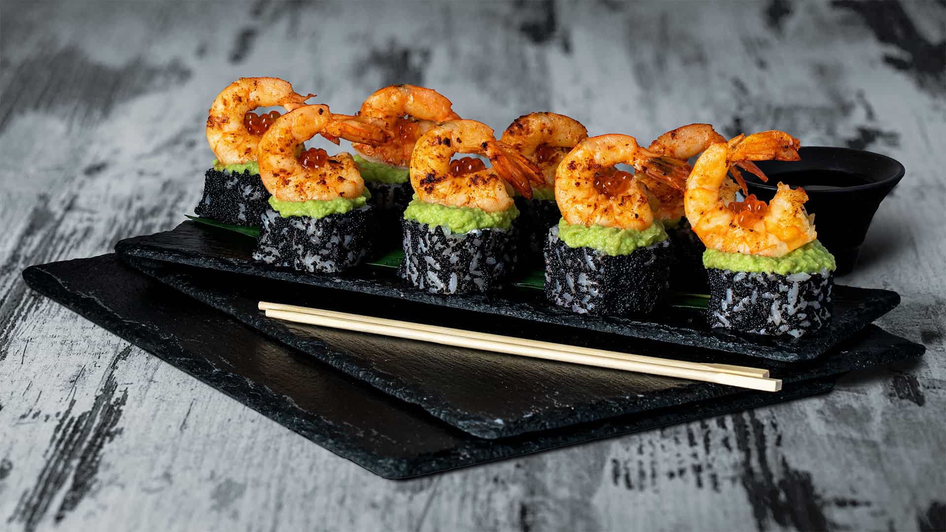 Склад: Креветка обсмажена у вершках, лосось, ікра лососева, ікра тобіко, гуакамоле, манго, крем-сир