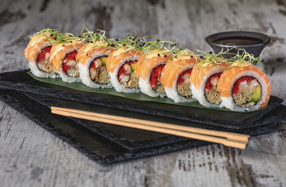 Состав: Угорь, Лосось, Икра Тобико, Омлет, Авокадо, Зеленый лук.