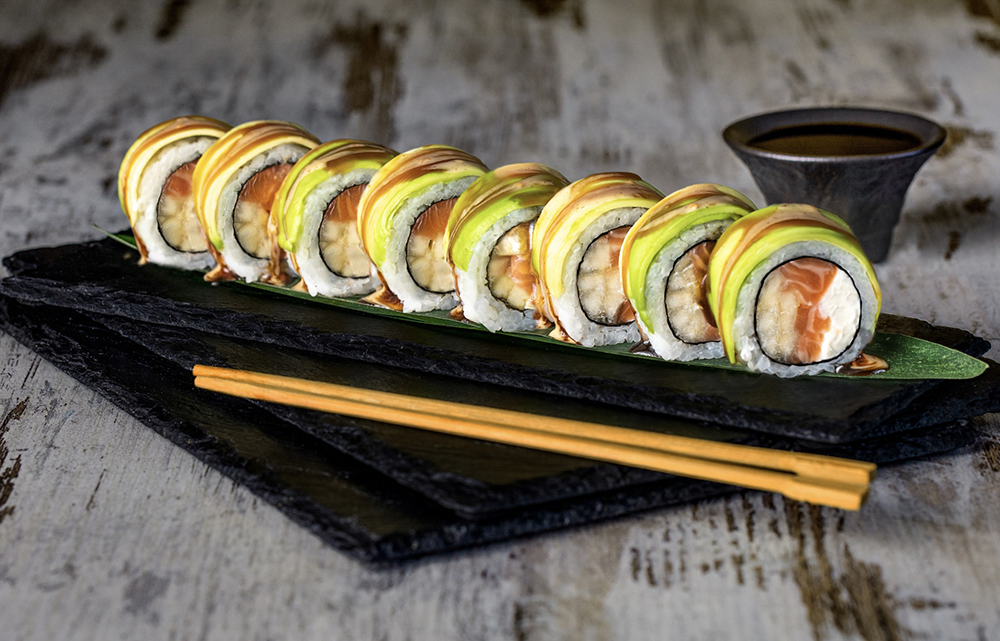 Состав: лосось, крем-сыр, груша, авокадо, ореховый соус, унаги.
