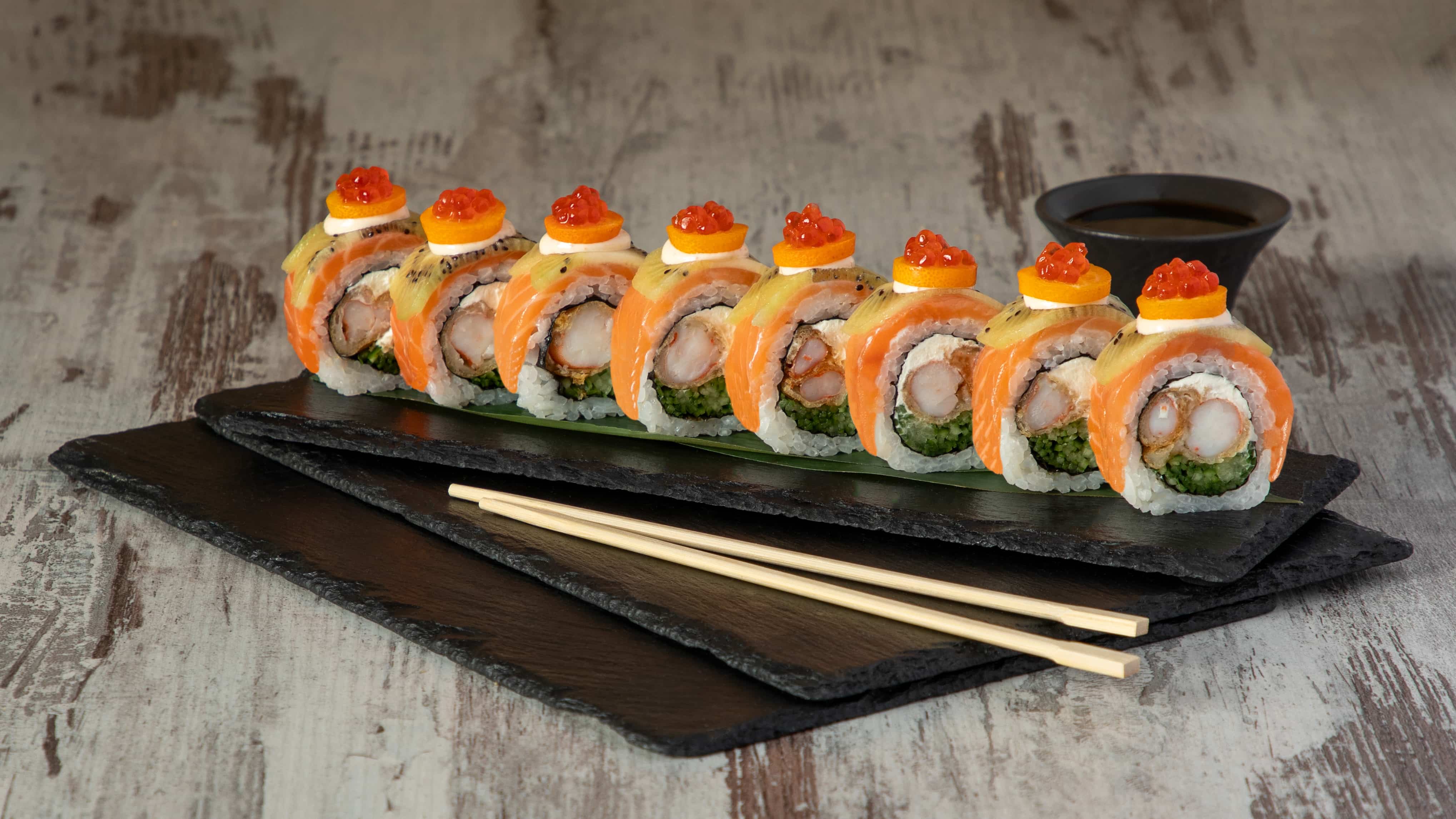 Состав: Креветка темпура, Лосось, Икра лосося, Крем-сыр, Огурец, Киви, Кумкват, Сливочній соус