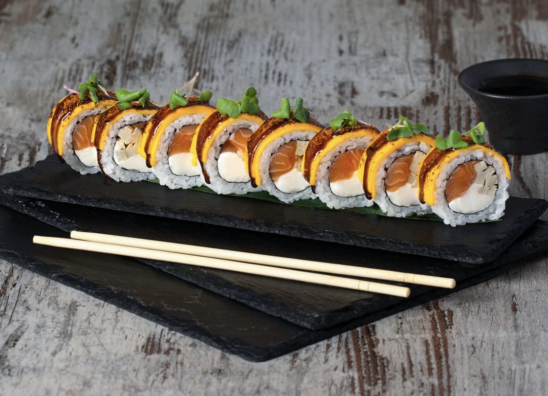 Состав: Лосось, Сыр Чеддер, Омлет, Крем-сыр, Соус унаги, Тагараши, Микрогрин, Рис, Нори