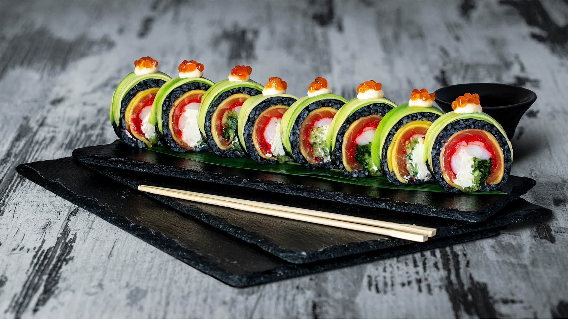 Состав: Лосось, Креветка, Икра лососевая, Икра тобико, Крем-сыр, Манго, Авокадо, Огурец, Сливочный соус