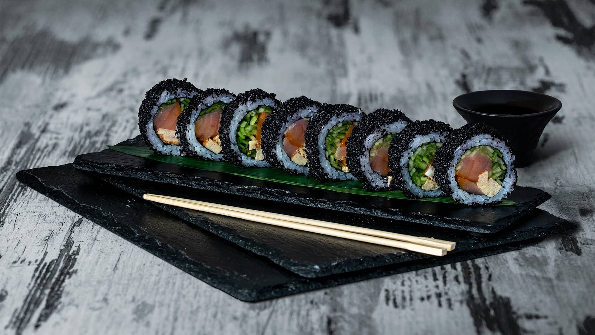 Состав: Лосось копченый, Омлет, Огурец, Икра тобико черная