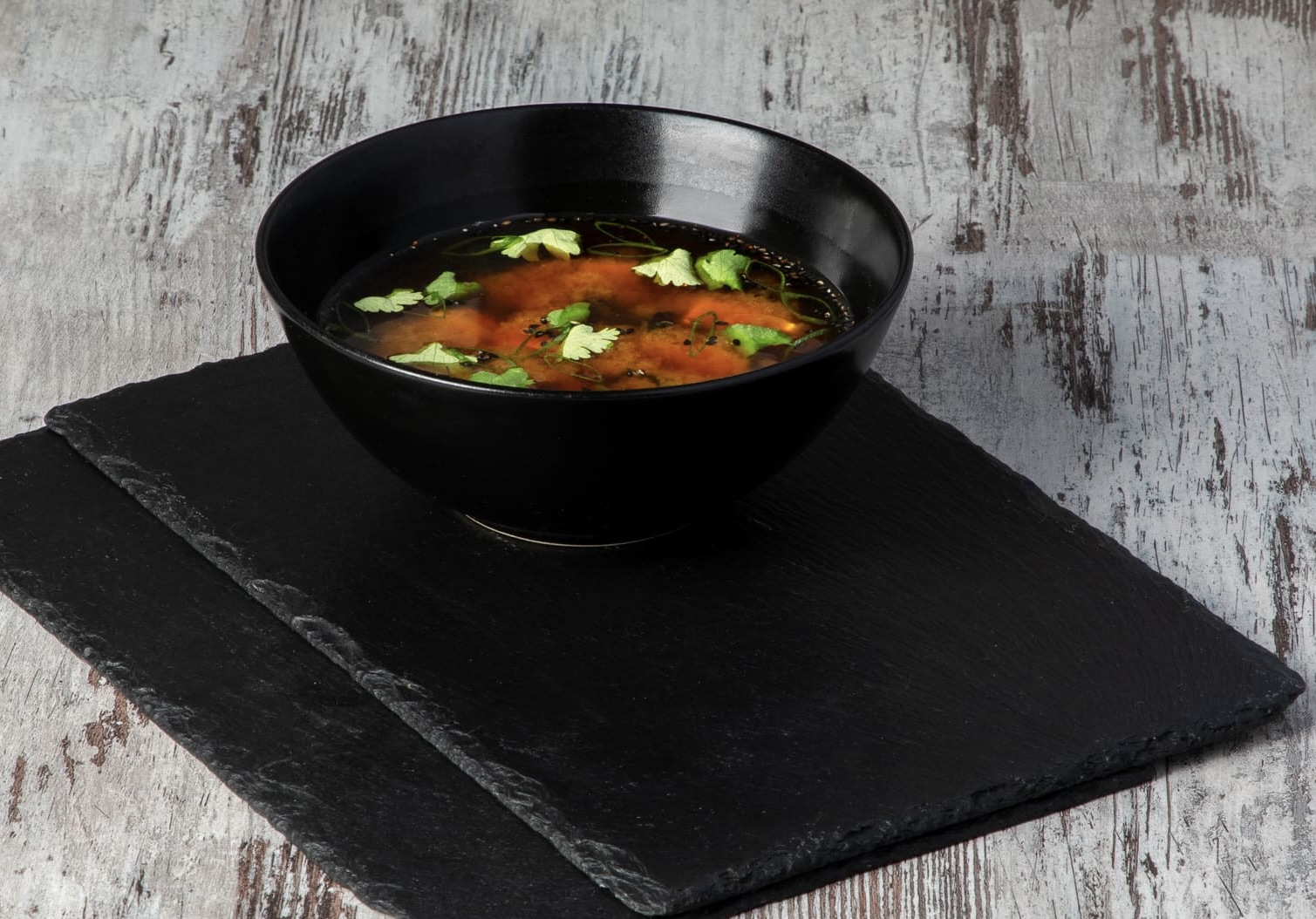 Состав: Мисо бульон, Водоросли вакаме, Тофу, Зеленый лук, Кинза, Кунжут