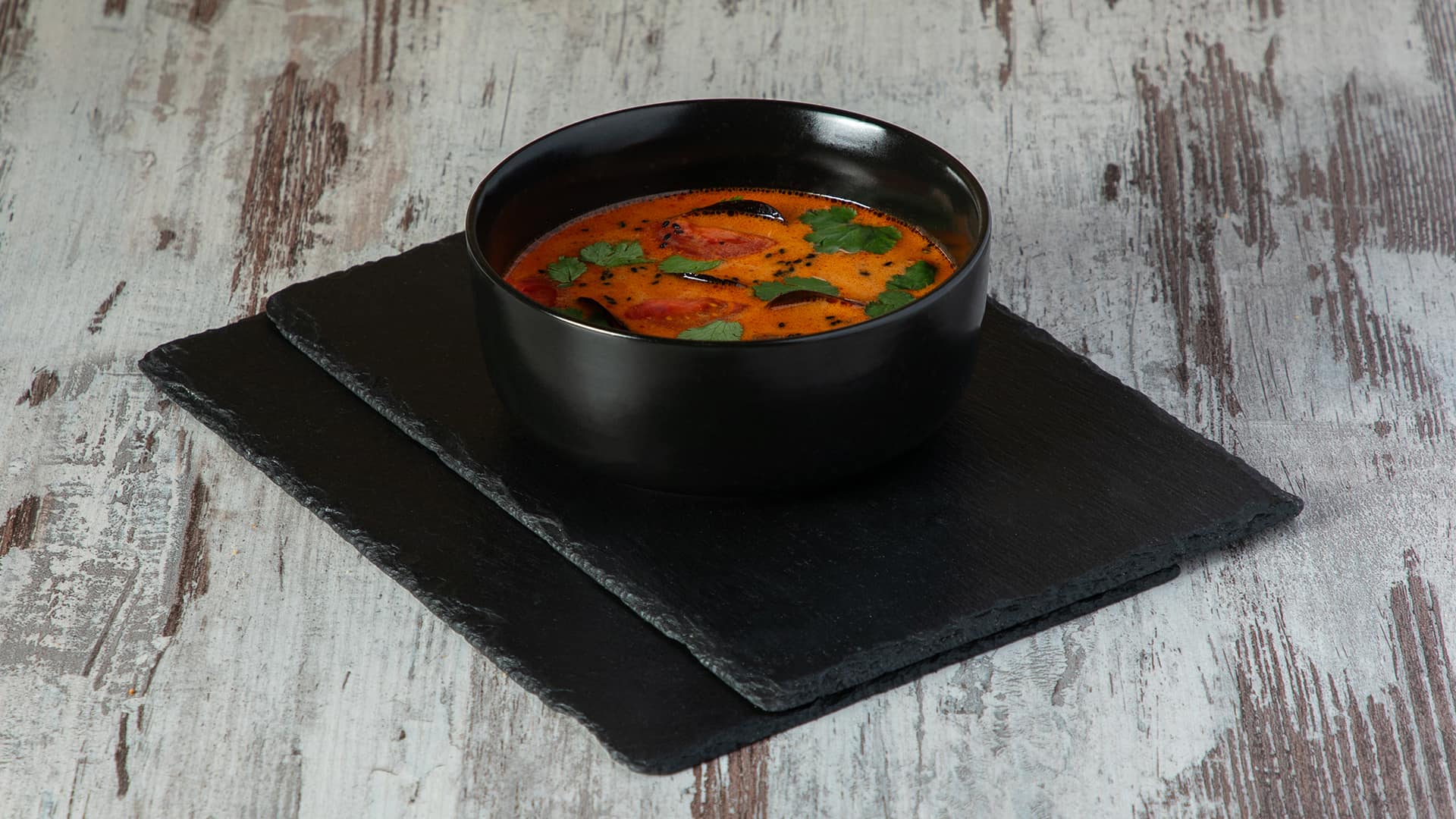 Состав: Куриный бульон, Креветка, Мидии, Грибы вешенки, Кокосовое молоко, Рыбный соус, Паста том ям, Тростниковый сахар, Галангал, Листья кафир лайма, Корень имбиря, Тагараши, Кинза, Лемонграс, Томаты черри