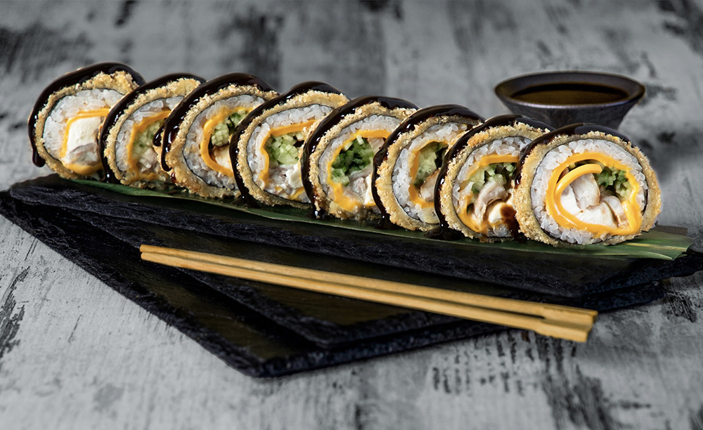Состав: Угорь, Сыр недр, Крем-сыр, Огурец, Темпура, Панно сухари, Унаги соус